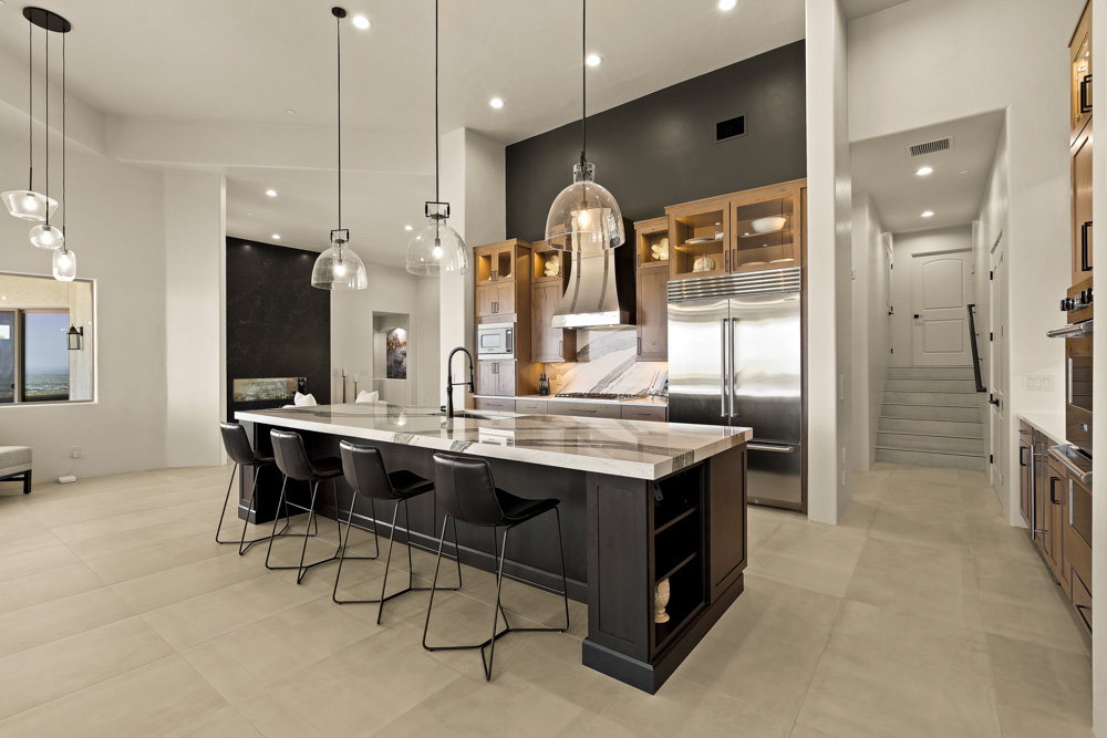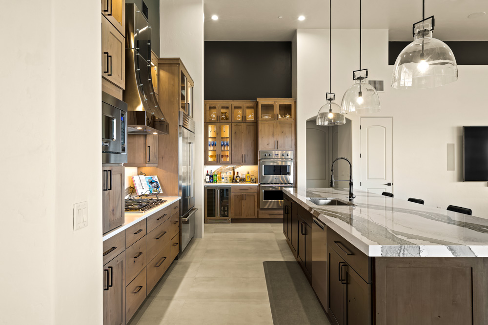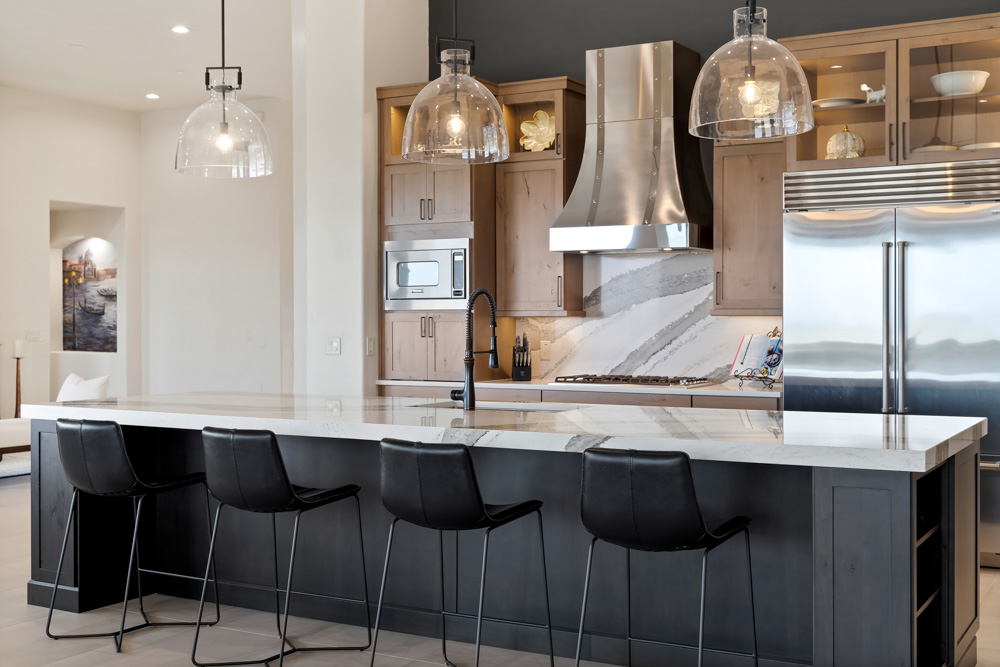 The original kitchen was boxed in with pillars, an oversized soffit, and outdated finishes. We reimagined the entire layout, removing obstructions, reconstructing the island, and adding modern cabinetry, countertops, and custom lighting. The result is a centerpiece kitchen that blends seamlessly into the open living space.