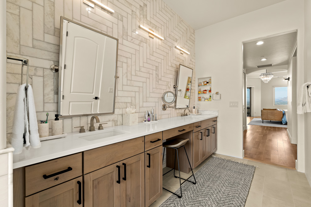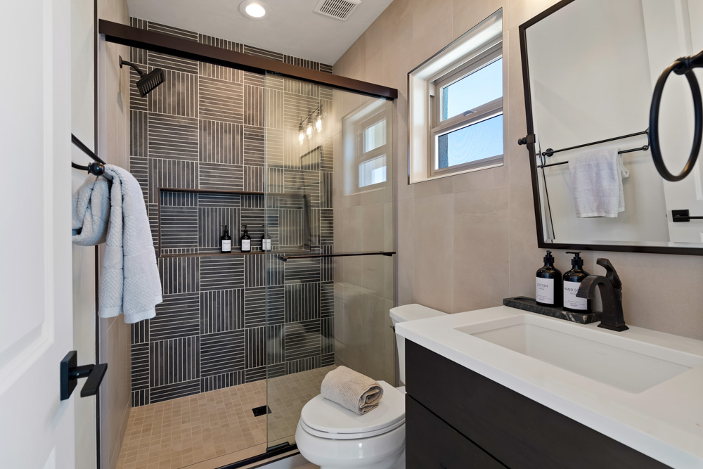 The master bathroom was redesigned with luxury in mind, featuring sleek tile details, bold black fixtures, and a spa-like bathtub and shower. The guest bathroom received a fresh update with a clean, modern rip-and-replace remodel.